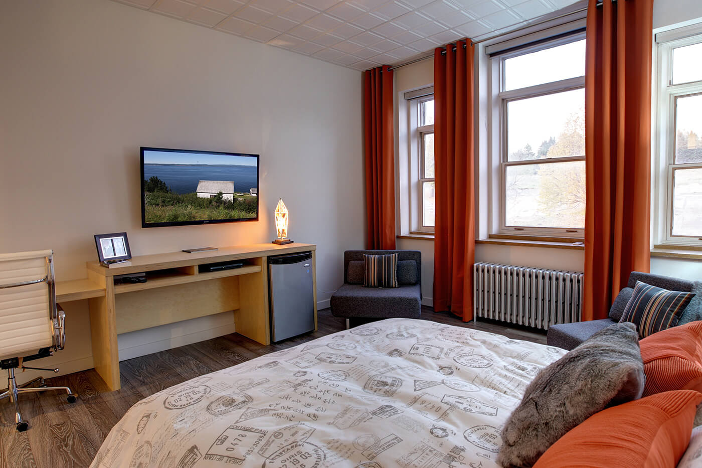 Cette magnifique suite corporative inclut un téléviseur de 50 pouces avec récepteur HD, internet haute vitesse filaire et Wi-Fi, un frigo, deux grands fauteuils, un grand lit queen et la possibilité d’avoir jusqu’à deux petits lits.